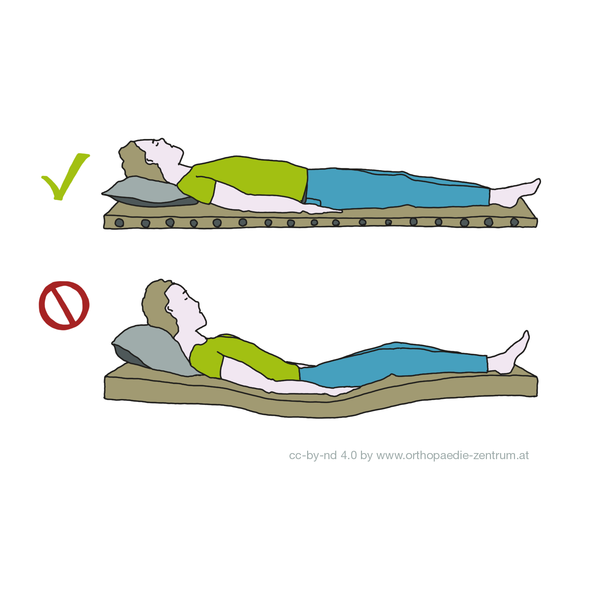 Vermeiden Sie eine durchgelegene Matratze. Zu empfehlen sind eine feste Unterlage (harter Bettrost) und darauf eine weiche Matratze, so dass der Körper überall gleichmäßig aufliegt. Keine zu großen oder dicken Kissen verwenden, die den Oberkörper halbe Sitzlage bringen. Günstig ist ein kleines und flaches Kissen zur Unterstützung von Kopf und Nacken.